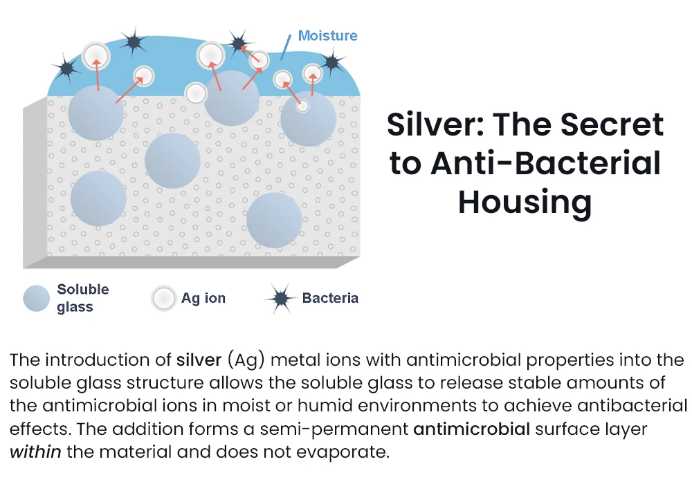 Für maximale hygienische Qualität ist das Chassis mit Silberionen infundiert, um mikrobielles Wachstum zu verhindern. Die Infusion nutzt sich nicht im Laufe der Zeit durch wiederholtes Reinigen ab wie bei anderen medizinischen Produkten, die beschichtet oder mit einem Film behandelt sind. Dies erleichtert die wiederholte Desinfektion zwischen den Benutzern und ist ideal für immunempfindliche Umgebungen.