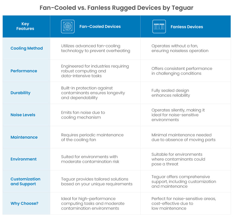 Die Wahl zwischen lüftergekühlten oder lüfterlosen Geräten muss keine Herausforderung sein. Wir von Teguar bieten Ihnen maßgeschneiderte Lösungen für Ihre individuellen Anforderungen und stellen sicher, dass Ihre robusten Geräte nie hinter den Erwartungen zurückbleiben.