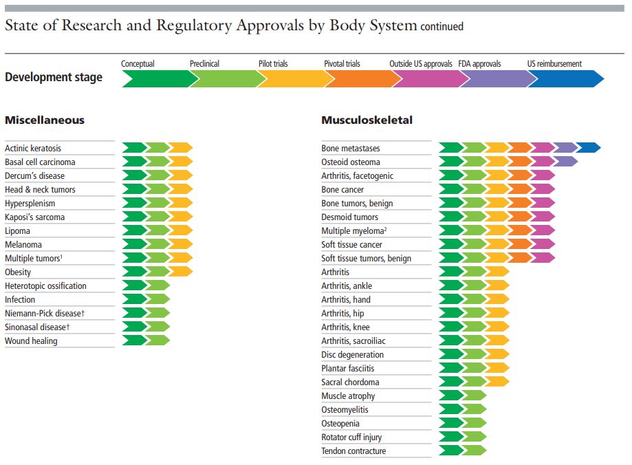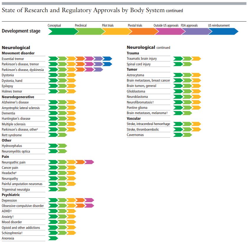 Die folgenden Auszüge aus einem Bericht aus dem Jahr 2022, der aus dem State of the Field Report der Focused Ultrasound Foundation zusammengestellt wurde, geben einen Überblick über die zunehmenden Einsatzmöglichkeiten der Technologie. Die Behandlungsbereiche sind aufgeführt, wobei grün für die konzeptionelle Phase, rot für die FDA-Zulassung und lila für die US-Zulassung der Behandlung steht. Sie sehen die schiere Anzahl (159) von Anwendungen, die sich in der Entwicklungsphase befinden und hoffentlich innerhalb von zwei Jahren zugelassen werden.
